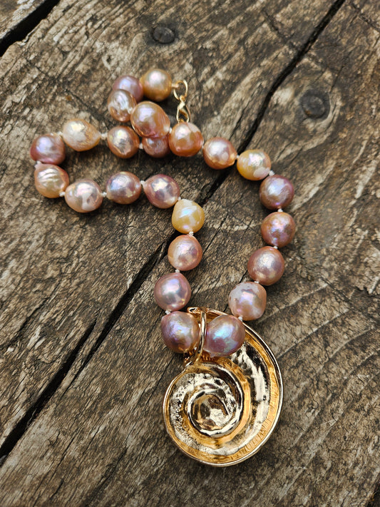 Golden Pink Pearl and Golden Ammonite Necklace