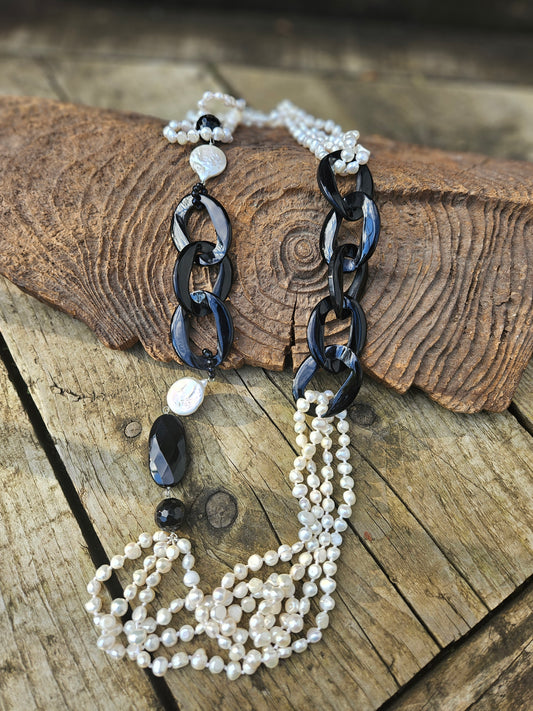 Freshwater Pearl, Resin and Onyx Necklace