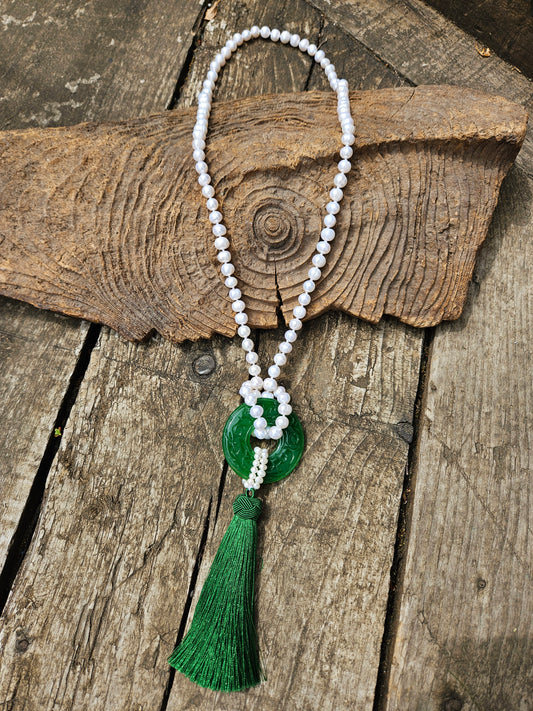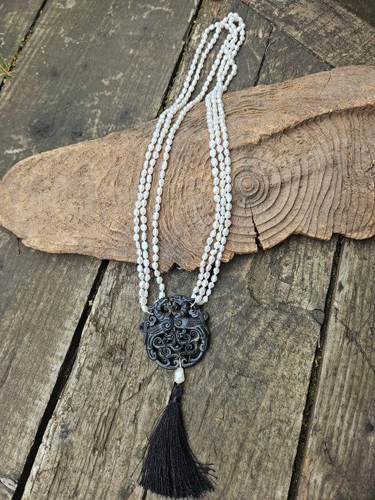 Bamboo Coral and Black Crystal Necklace with Hardstone Pendant