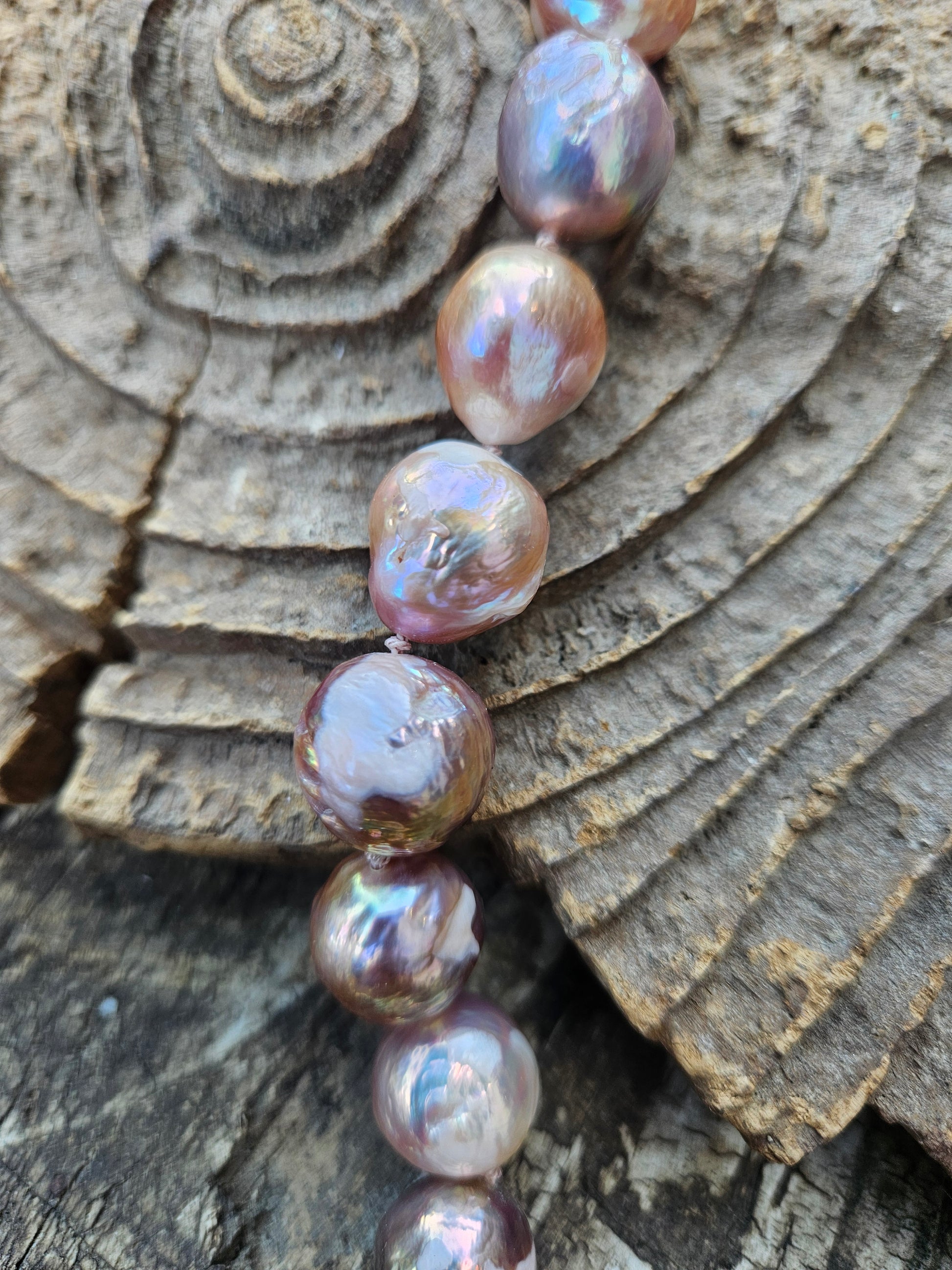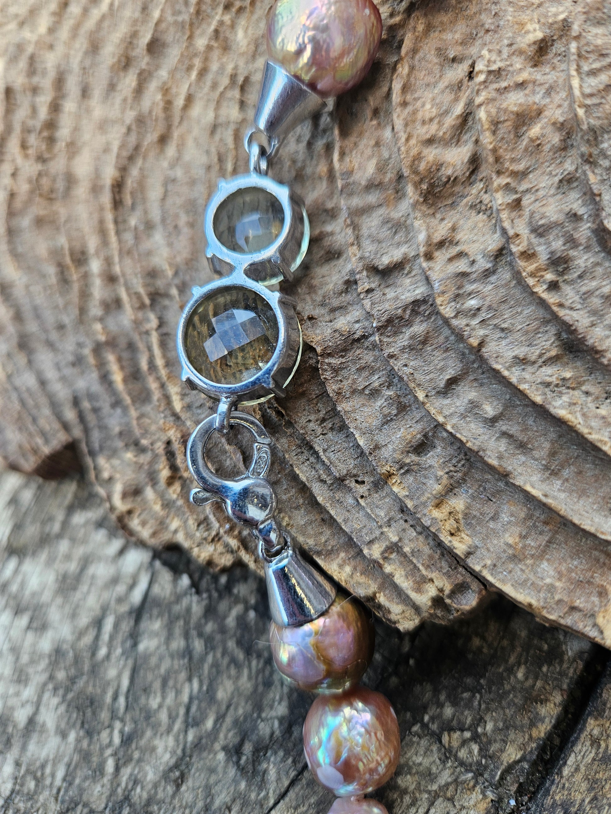 Golden pink tone baroque freshwater pearls on one-off unique handmade lemon quartz silver clasp. The pearls are individually knotted on silk and it is finished on this beautiful double faceted lemon quartz Stone clasp, set into 925 silver.