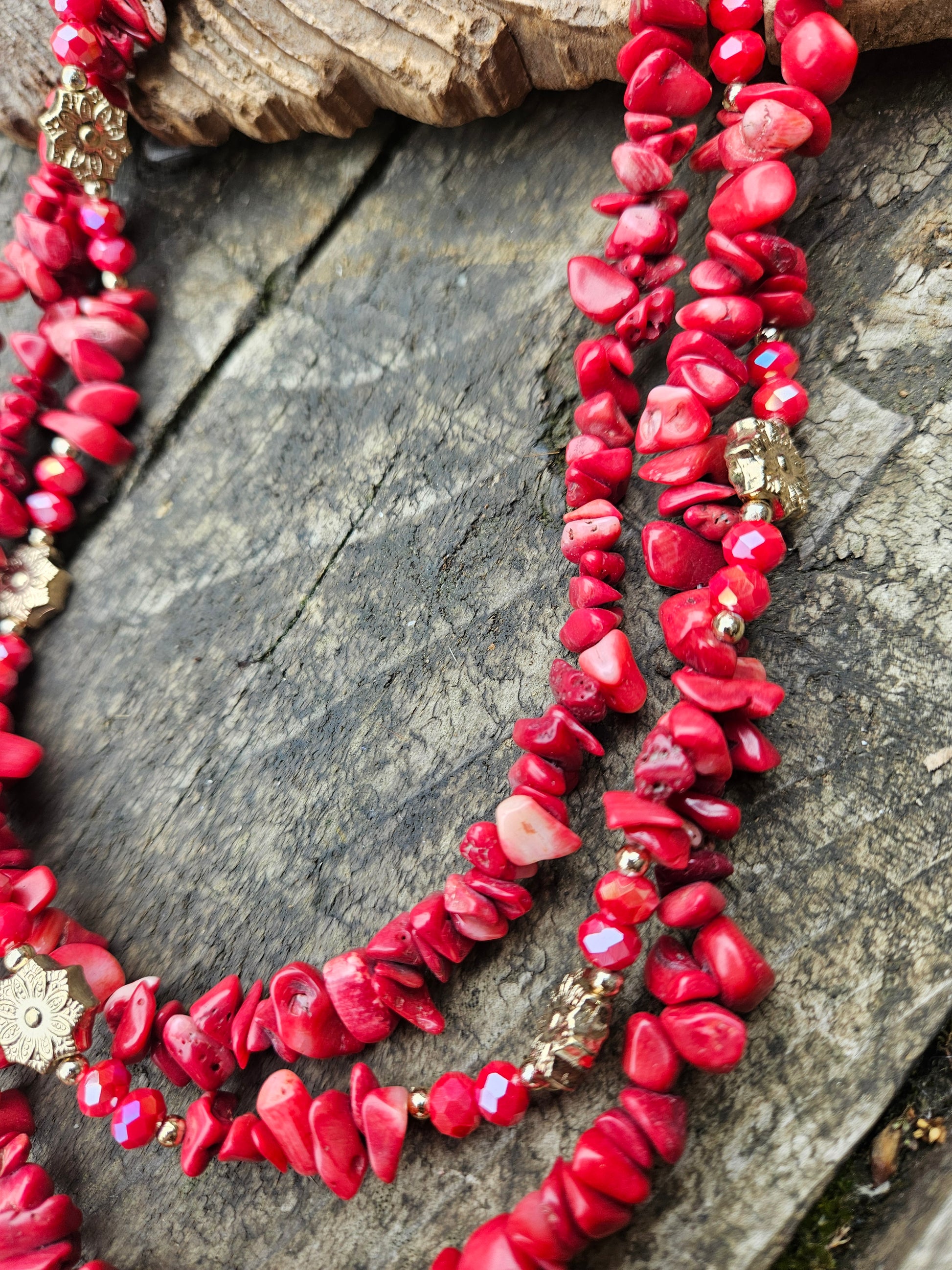 Statement boho vibe necklace made using chips of Bamboo Coral, blue crystal beads, brushed gold tone findings and hammered effect gold tone chain. Measuring approximately 85cms in length, with the optional use of the extender chain.