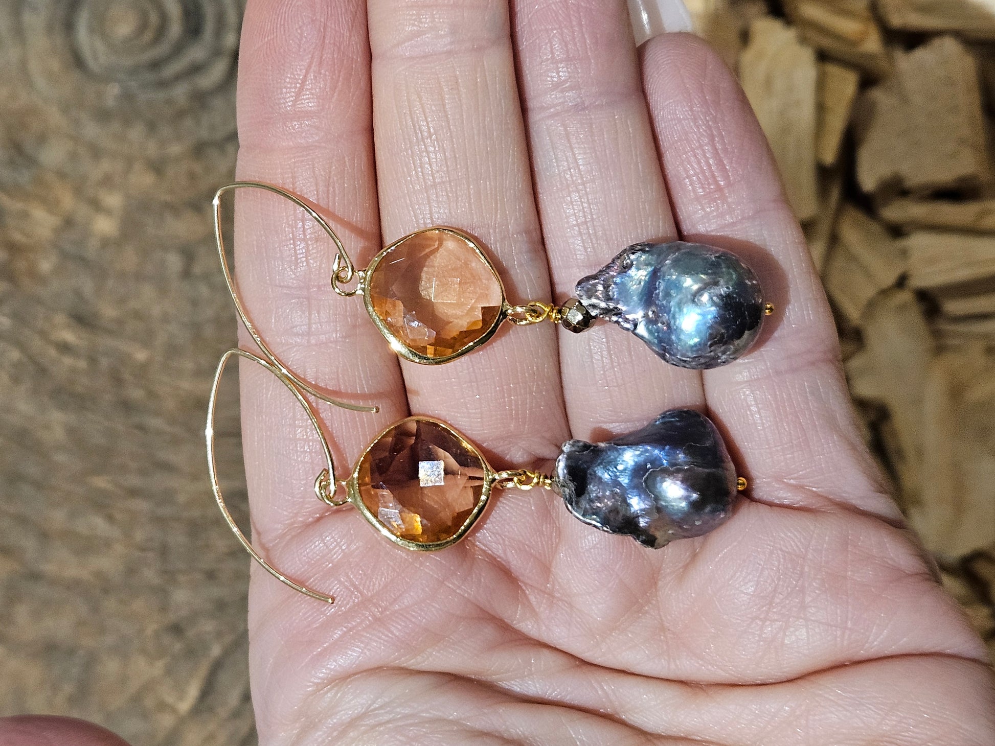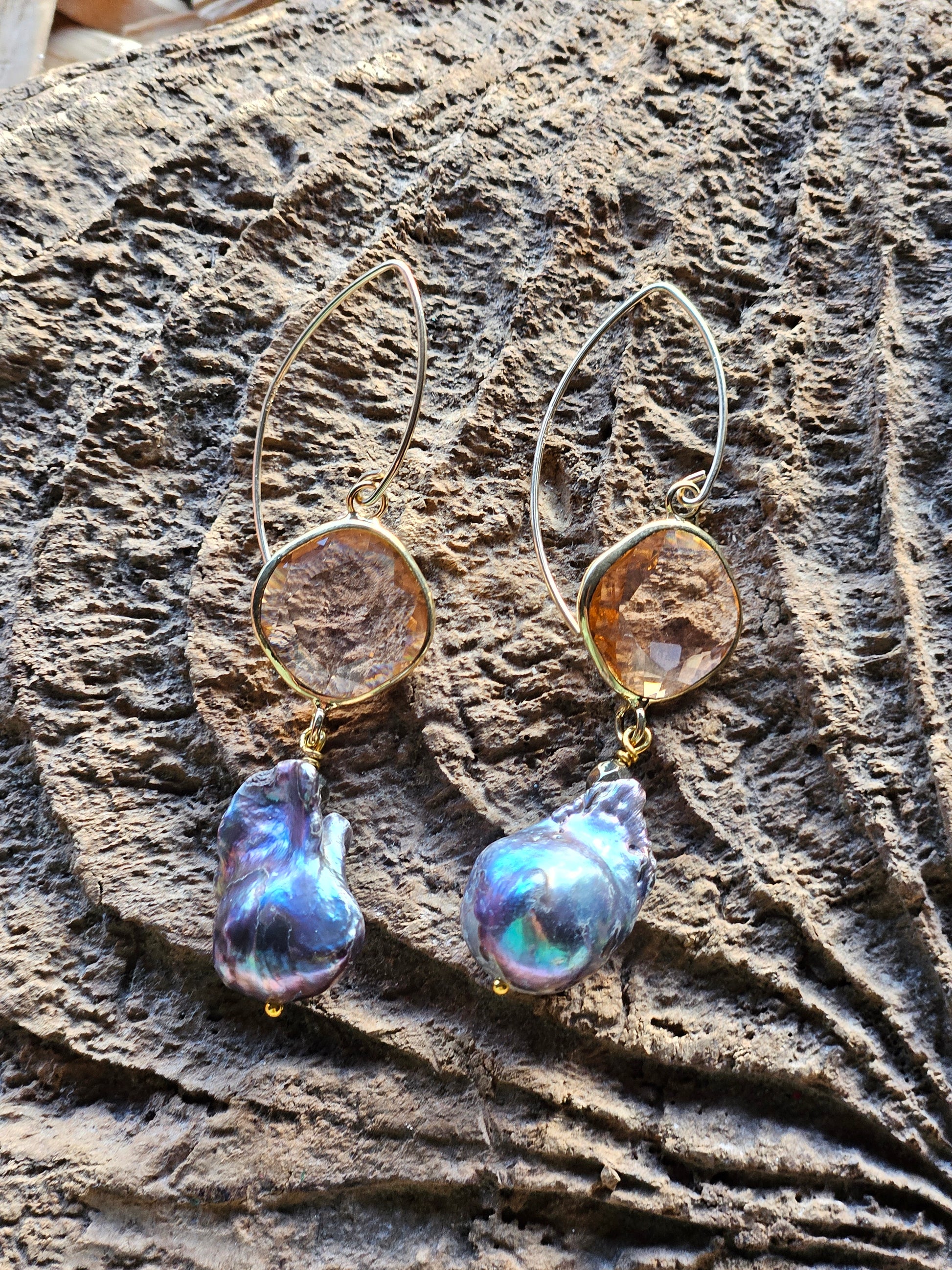 Black baroque pearls with faceted peach glass crystals above, finished on a 925 silver and gold plated long hooks. Measuring approximately 6.8cms and weighing 5-7g each.