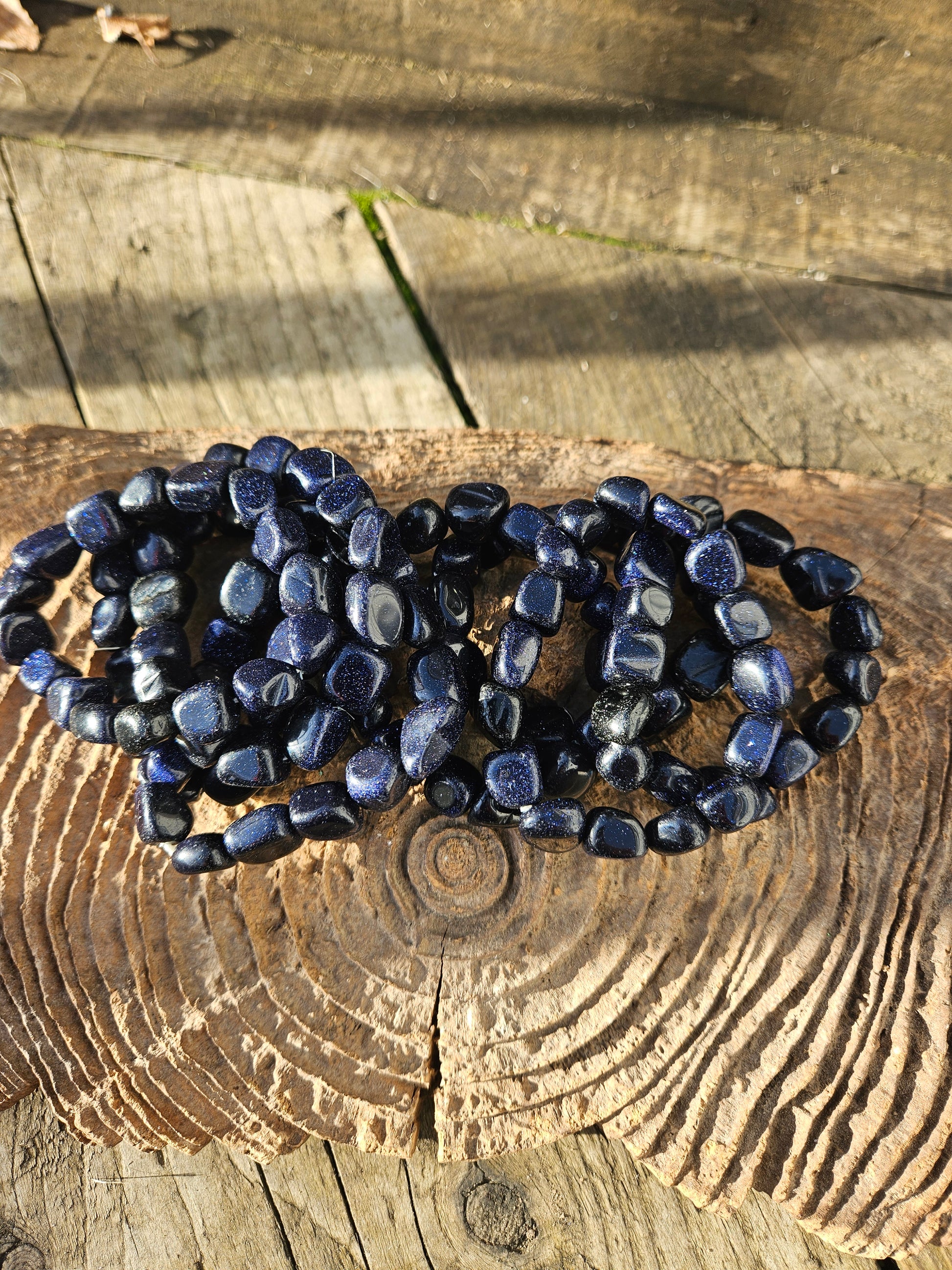 Glittering beads of Blue Goldstone strung on elastic as a simple but striking bracelet. The listing is for one of the bracelets in the photos.