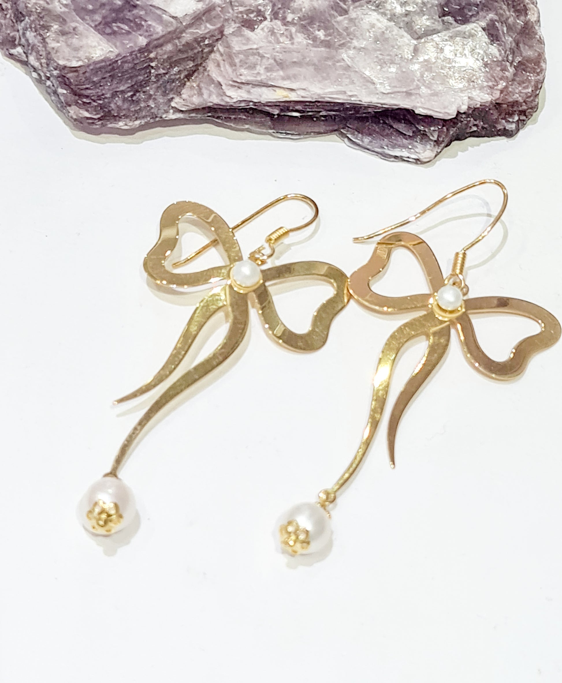 925 Silver and gold plated bows with freshwater pearl detailing, finished on 925 silver earring hooks. Measuring approximately 6.5cms in length.