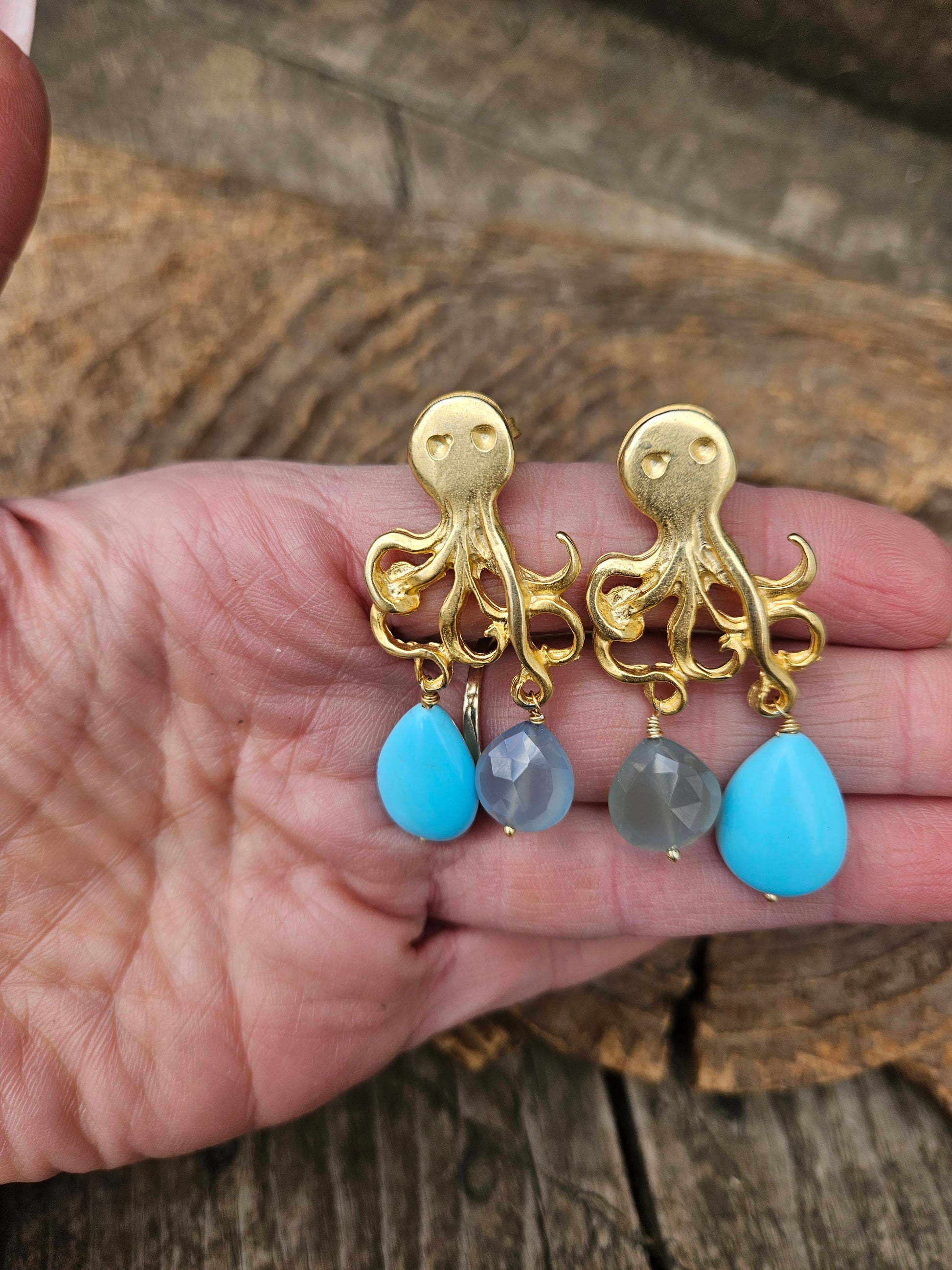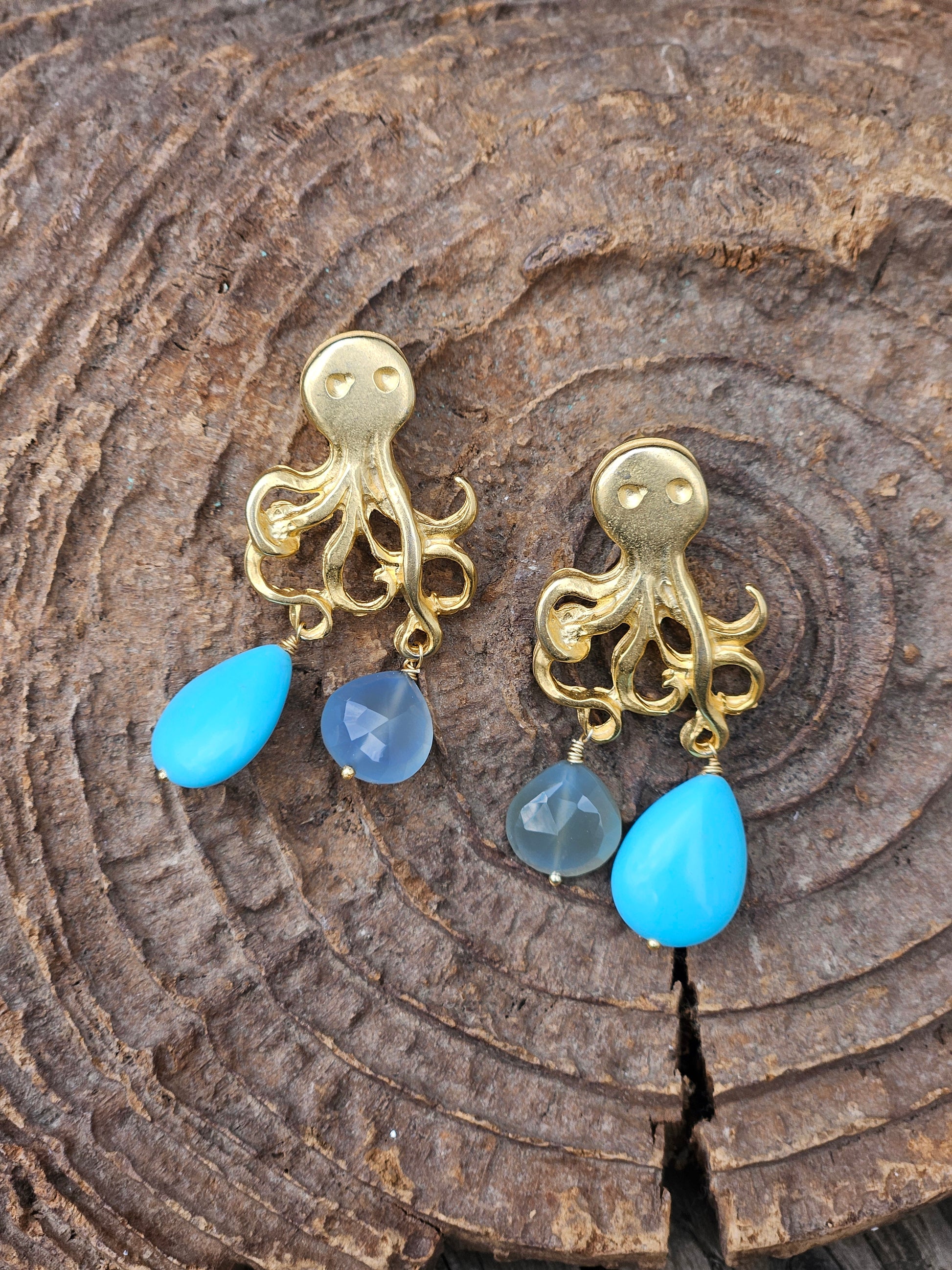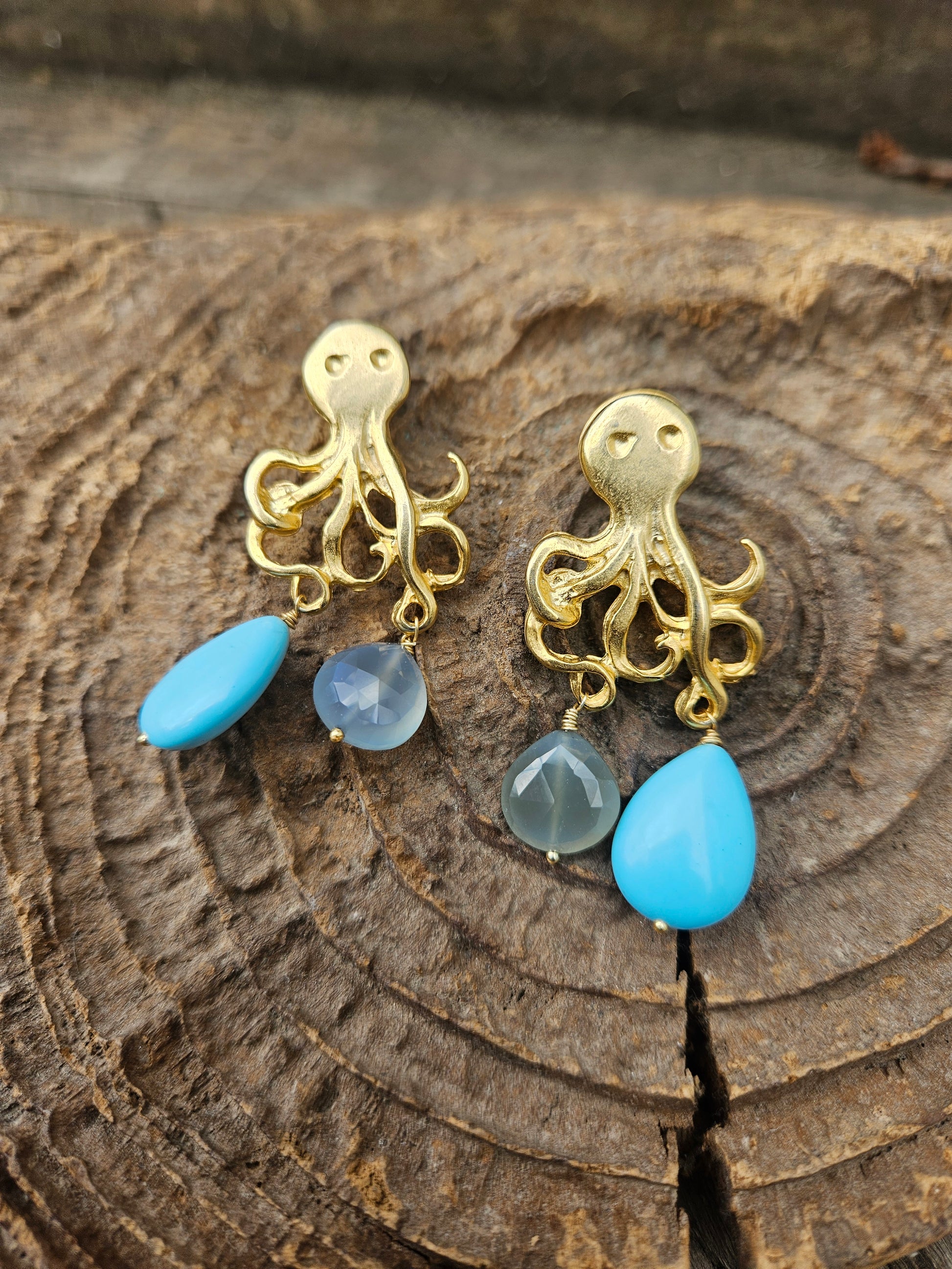 Golden coloured brass Octopus with polished stabilised Turquoise teardrops and faceted chalcedony teardrops hanging from them.