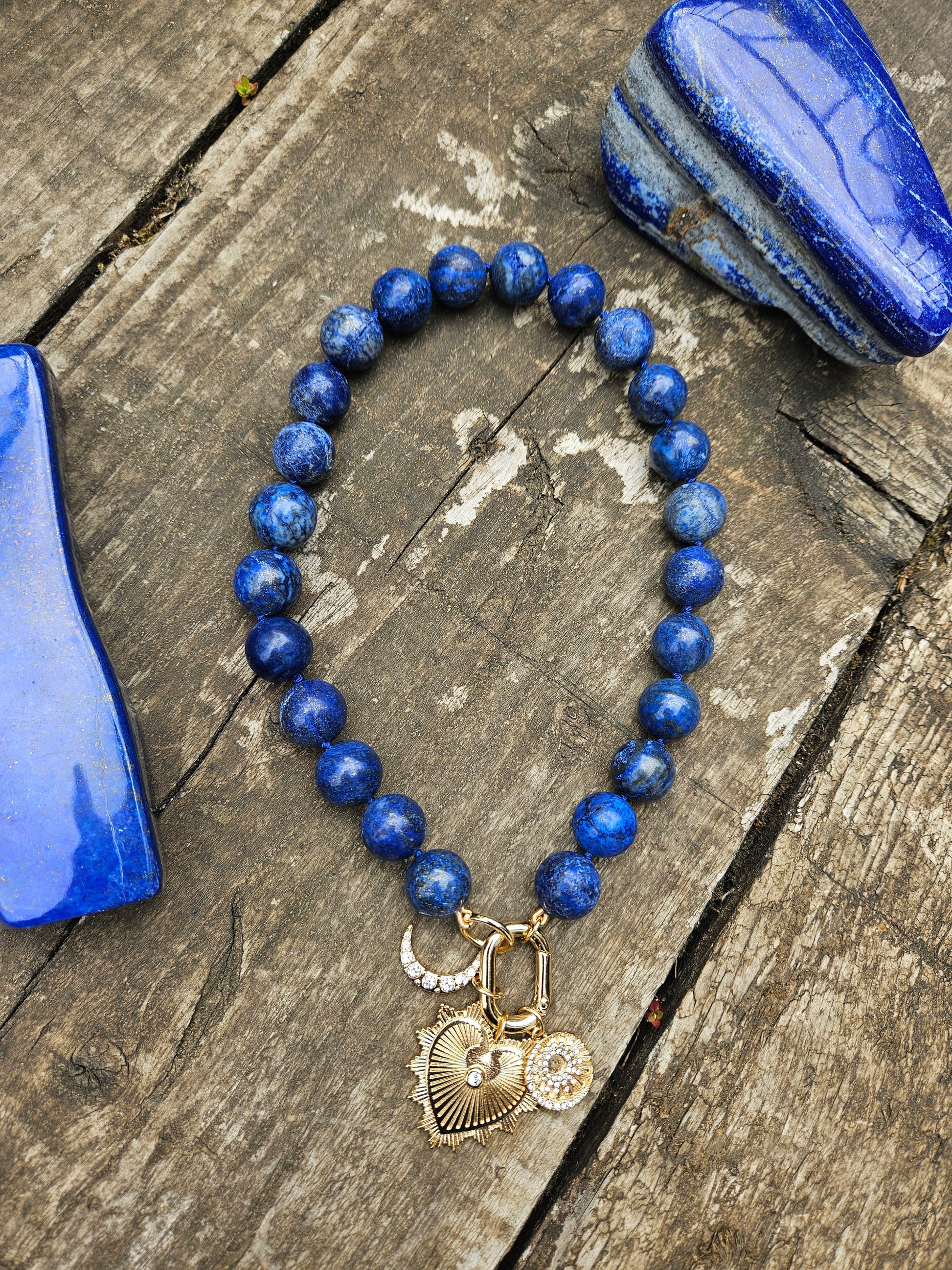 Semi polished and semi honed Lapis Lazuli beads mixed with ceramic beads. The central gold tone Starfish adds the perfect Summer tone.