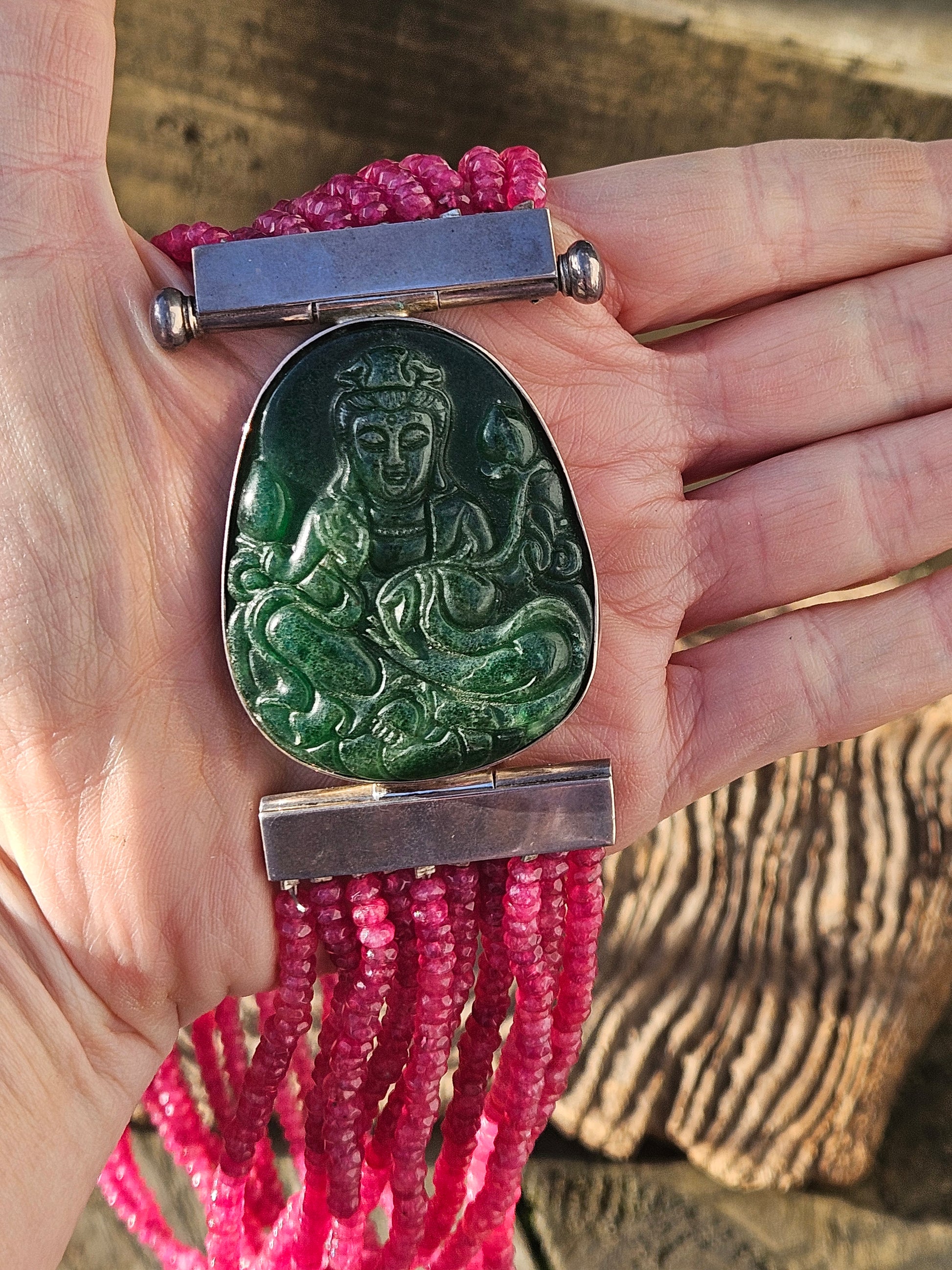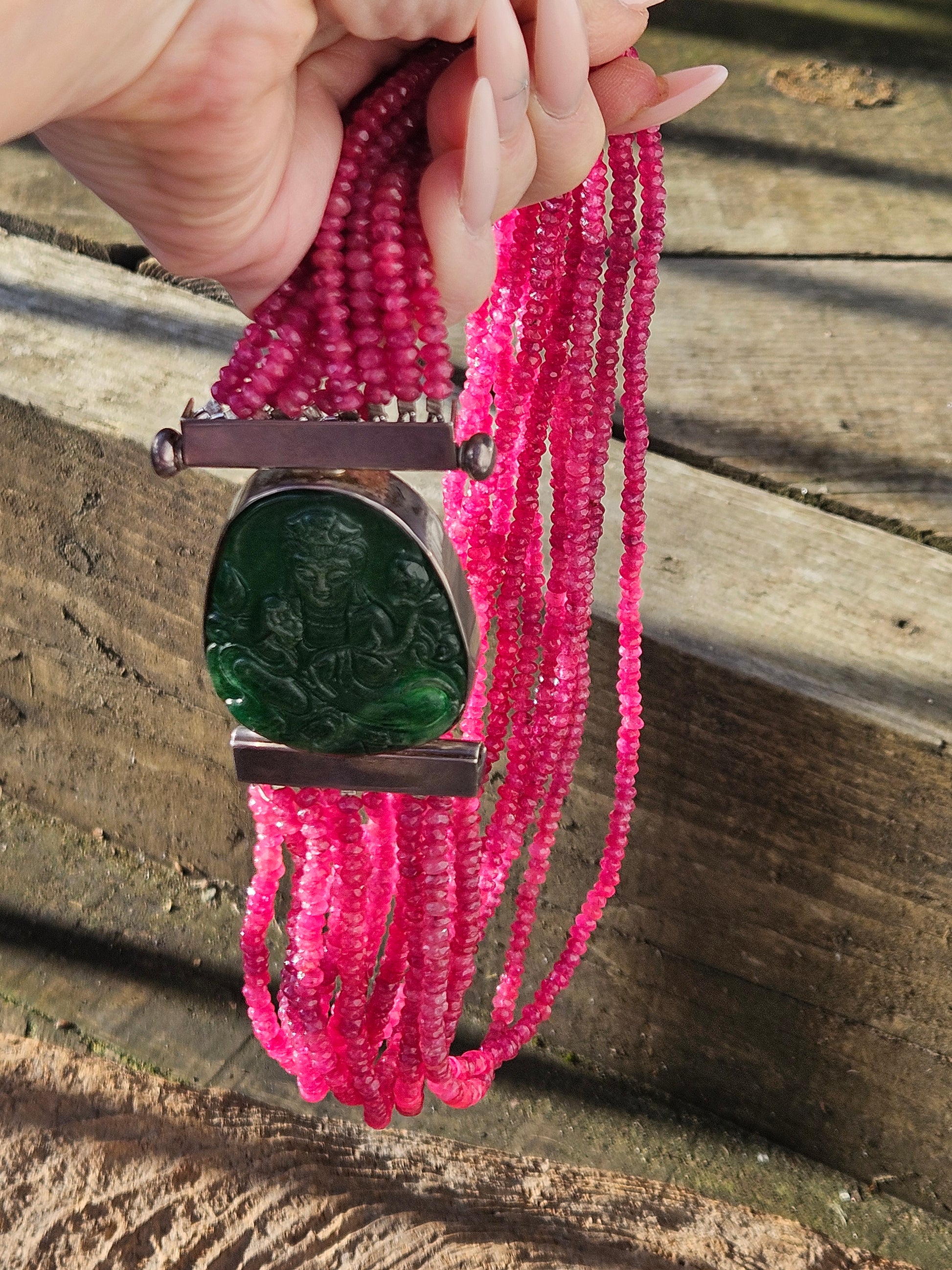 The clasp really makes this necklace. It has been handmade using 925 silver and a huge piece of carved Jade with the image of a deity. 10 clustered rows of faceted bright pink Jade cascade from this exquisite centre piece. This is completely unique, nobody else will have the same necklace as you.