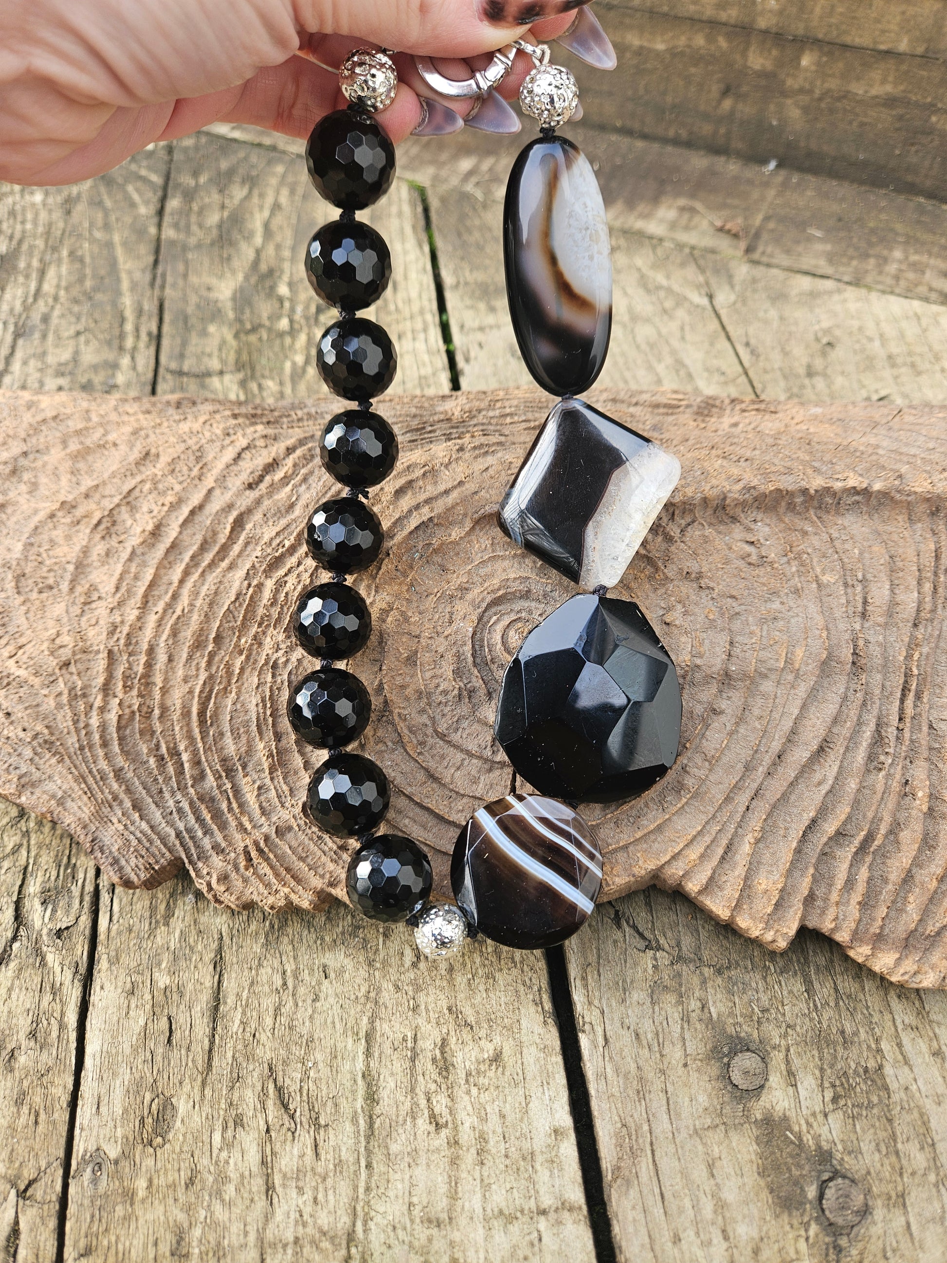A fabulous, one-off necklace of faceted Onyx and Agate divided by an electroplated lava bead and finished on a 925 silver clasp. Measuring 48cms in length.