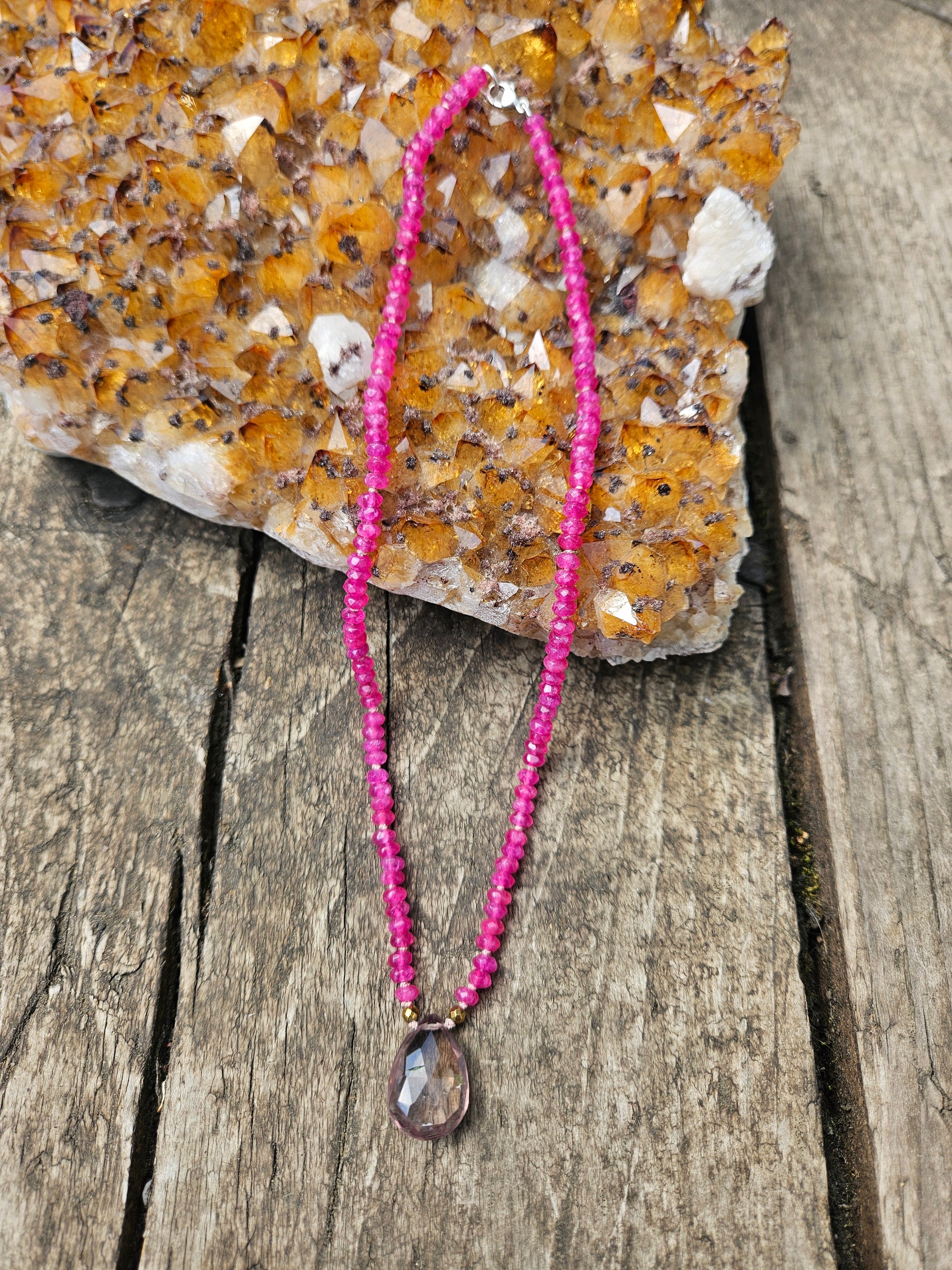 Faceted dyed pink jade beads with a Faceted Ametrine teardrop in the middle. Knotted on silk and finished on a 925 silver lobster clasp. Measuring approximately 39.5cms in length.