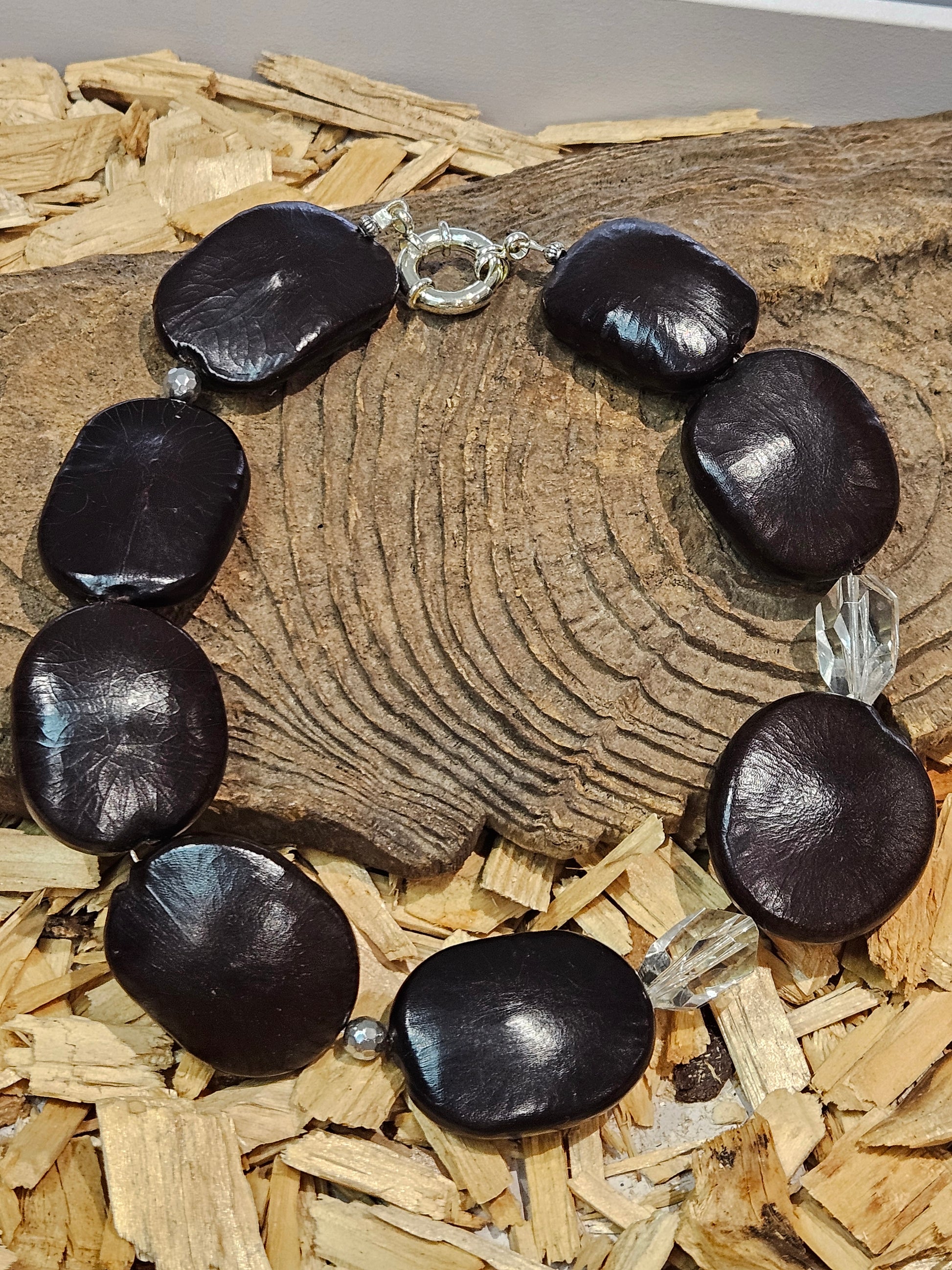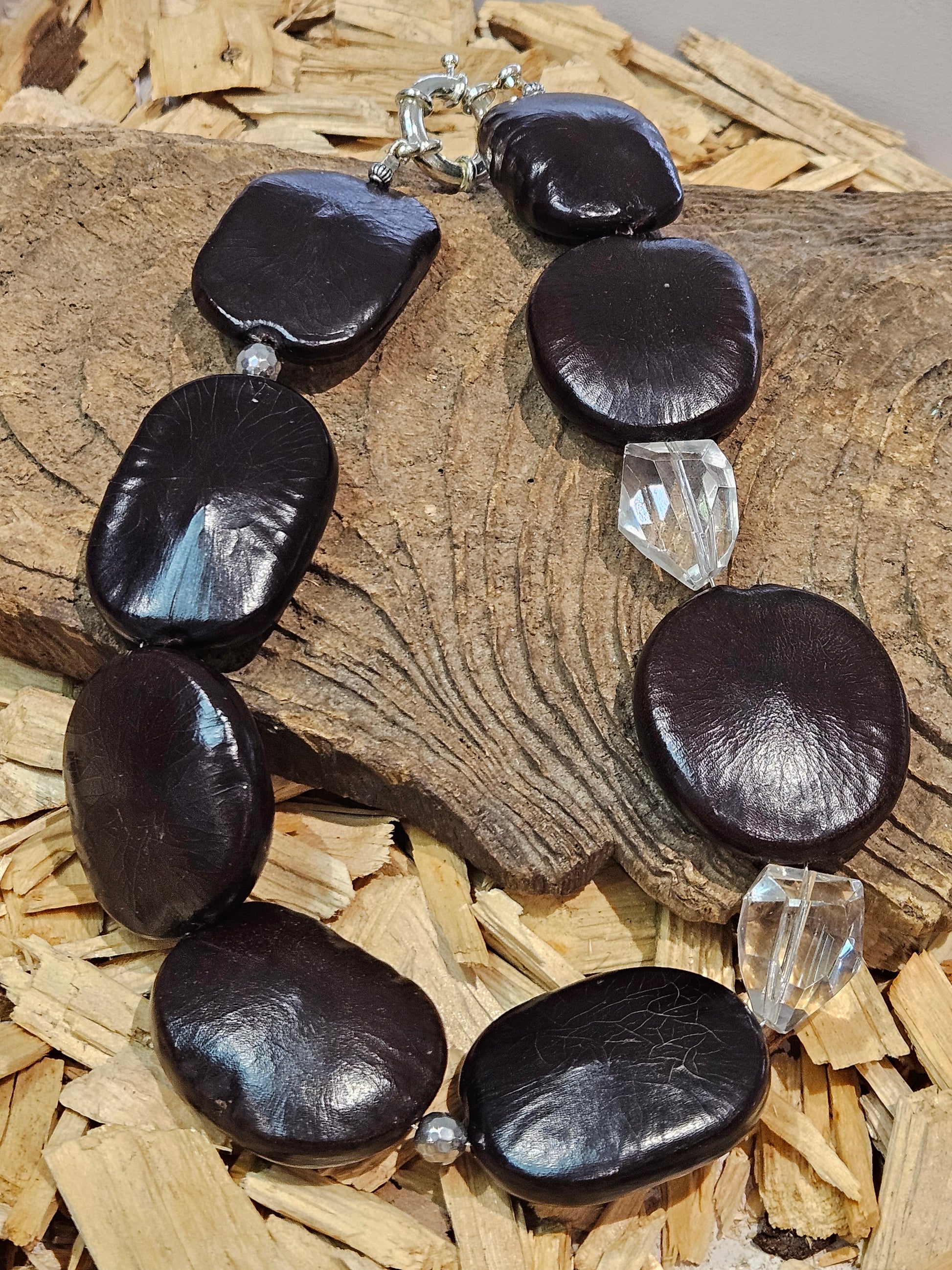 Large wooden beads that look like beans strung on wire and interspersed randomly with hematite beads, base metal beads and faceted Rock Crystal beads.