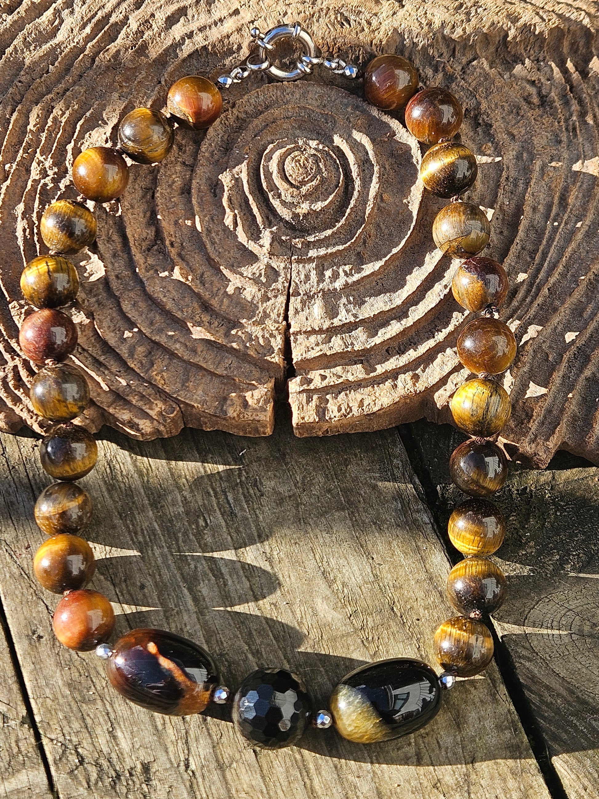Polished beads of Tiger's Eye with Agate and Hematite beads in the centre. Measuring 47cms in length.