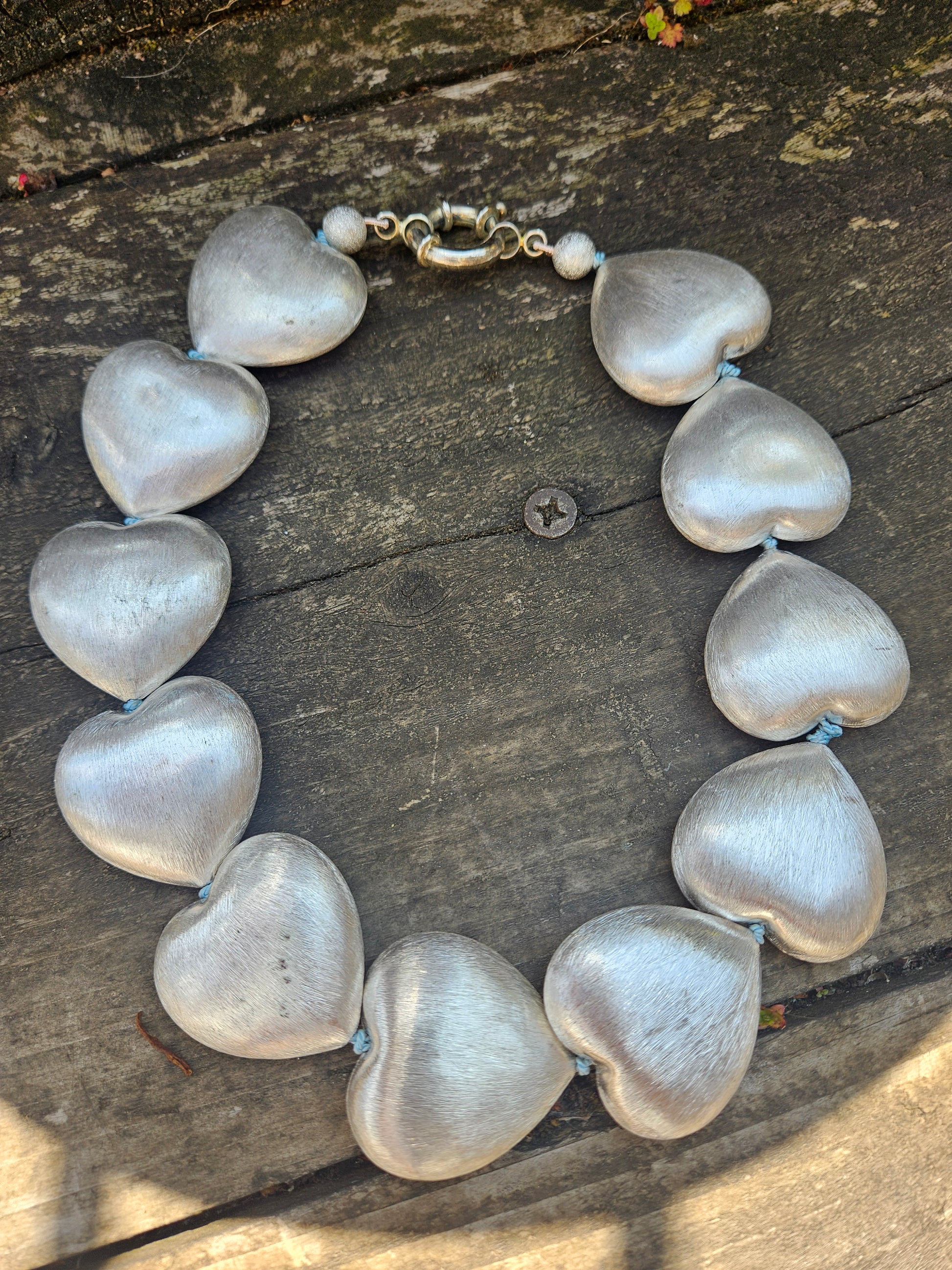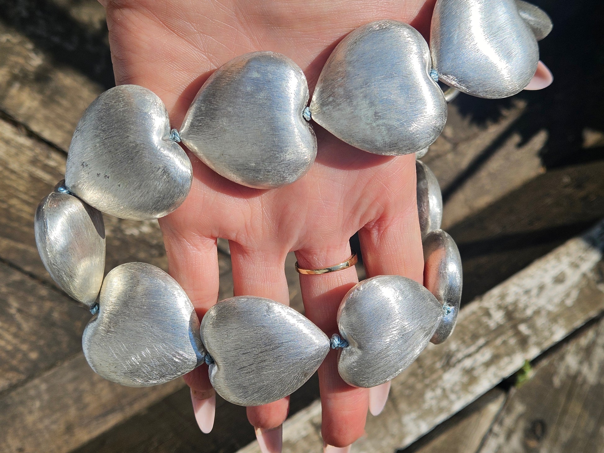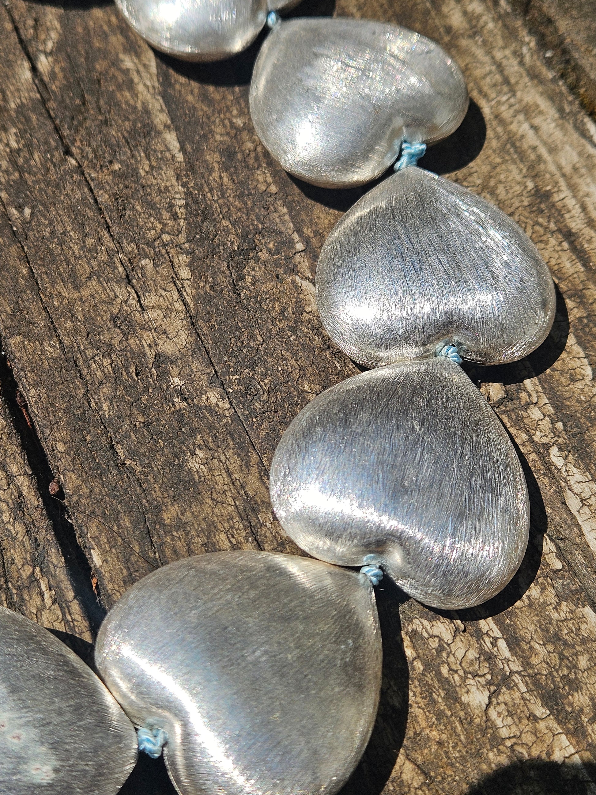 Hollow silver metal heart beads, knotted on silk and finished on a silver tone bolt clasp