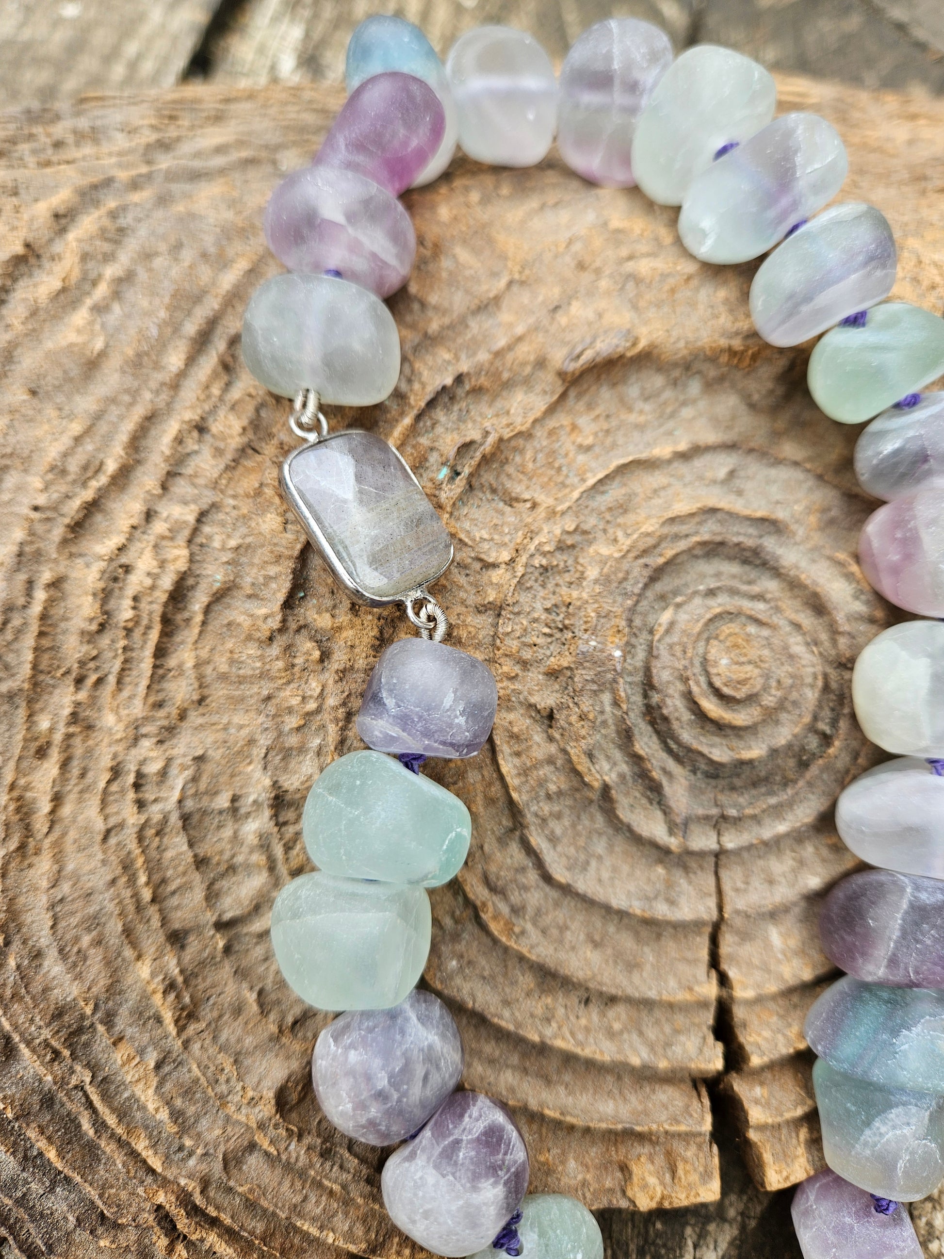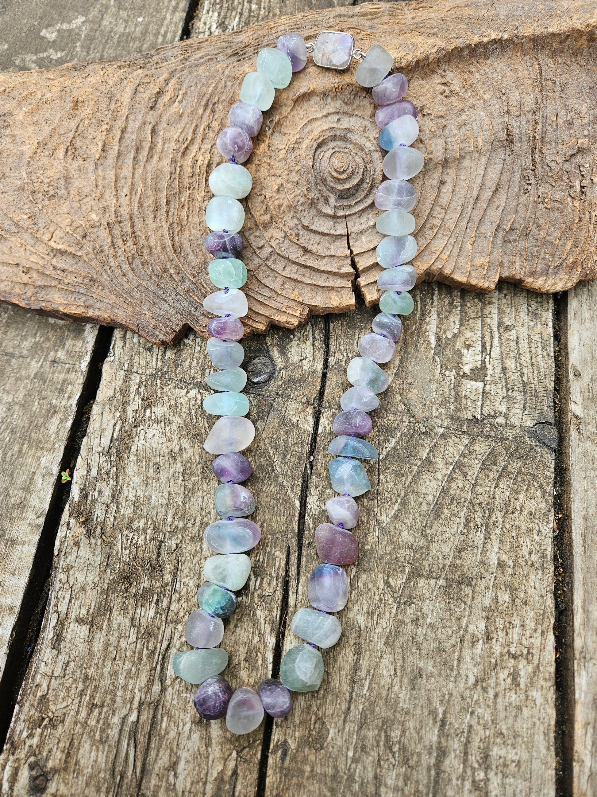 Frosted Fluorite beads ranging from green through to purple, knotted on silk and finished on a Labradorite stone finding. there is no clasp, it goes straight over the head.