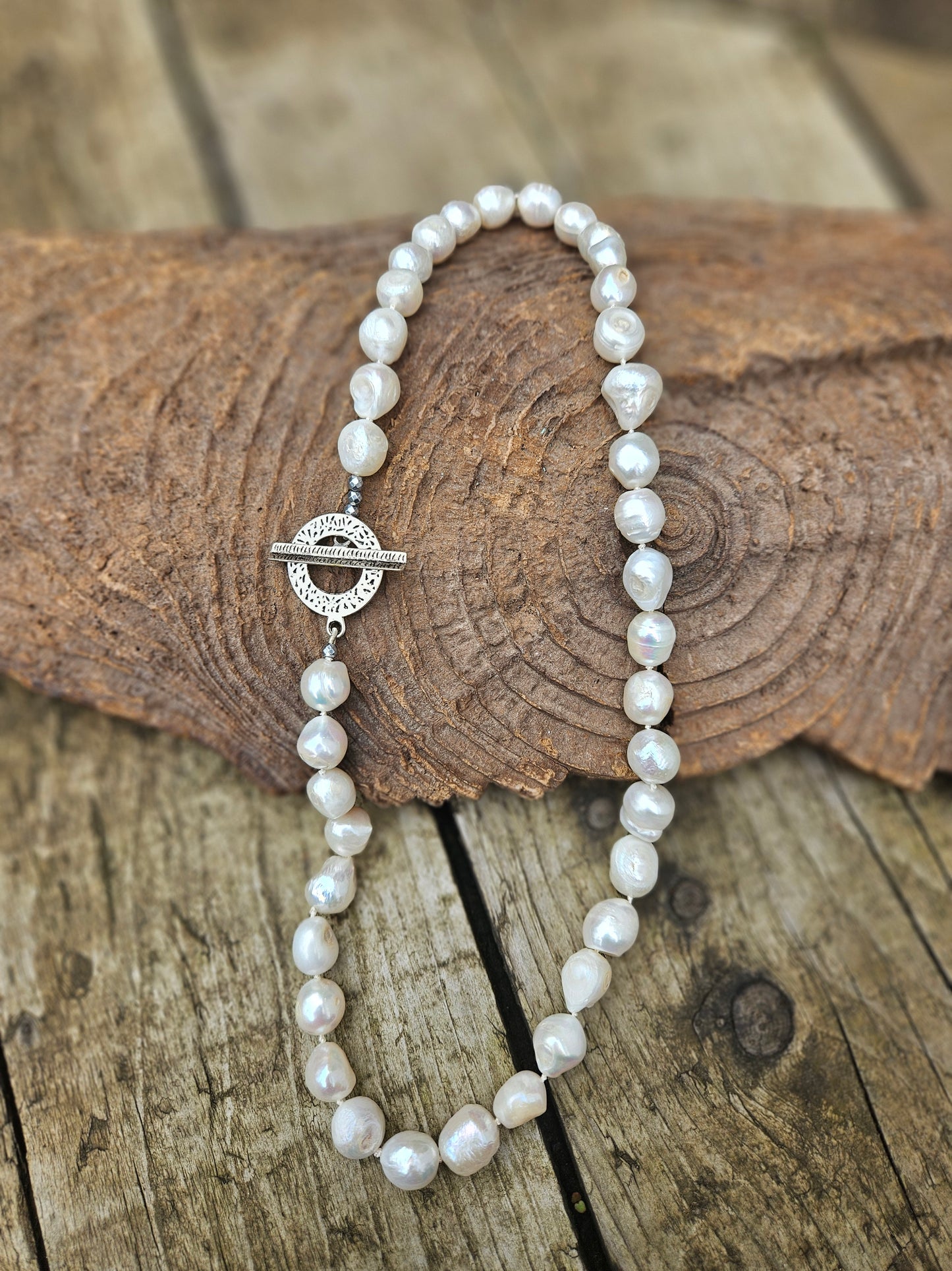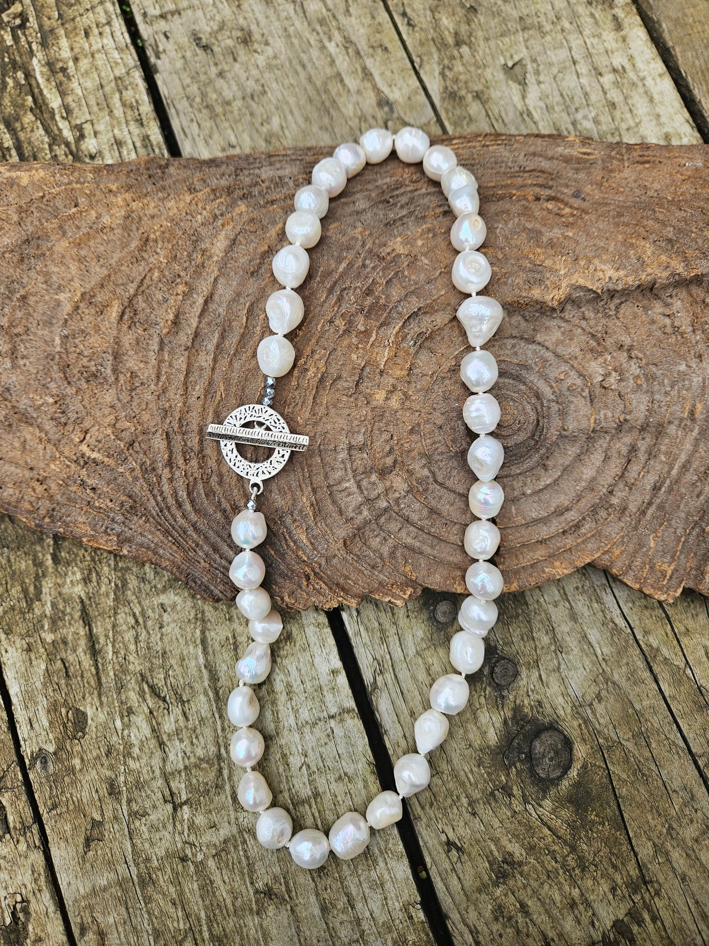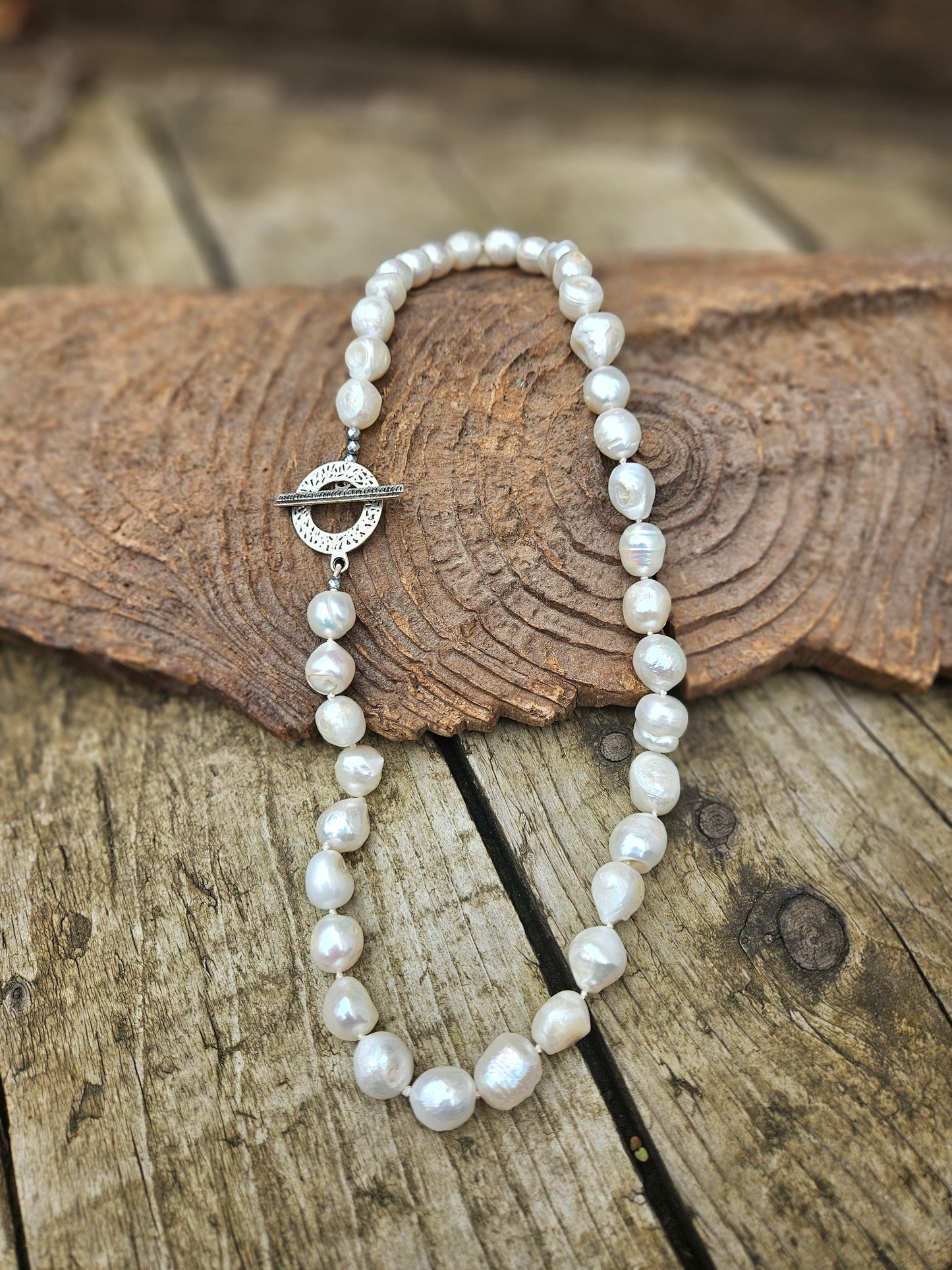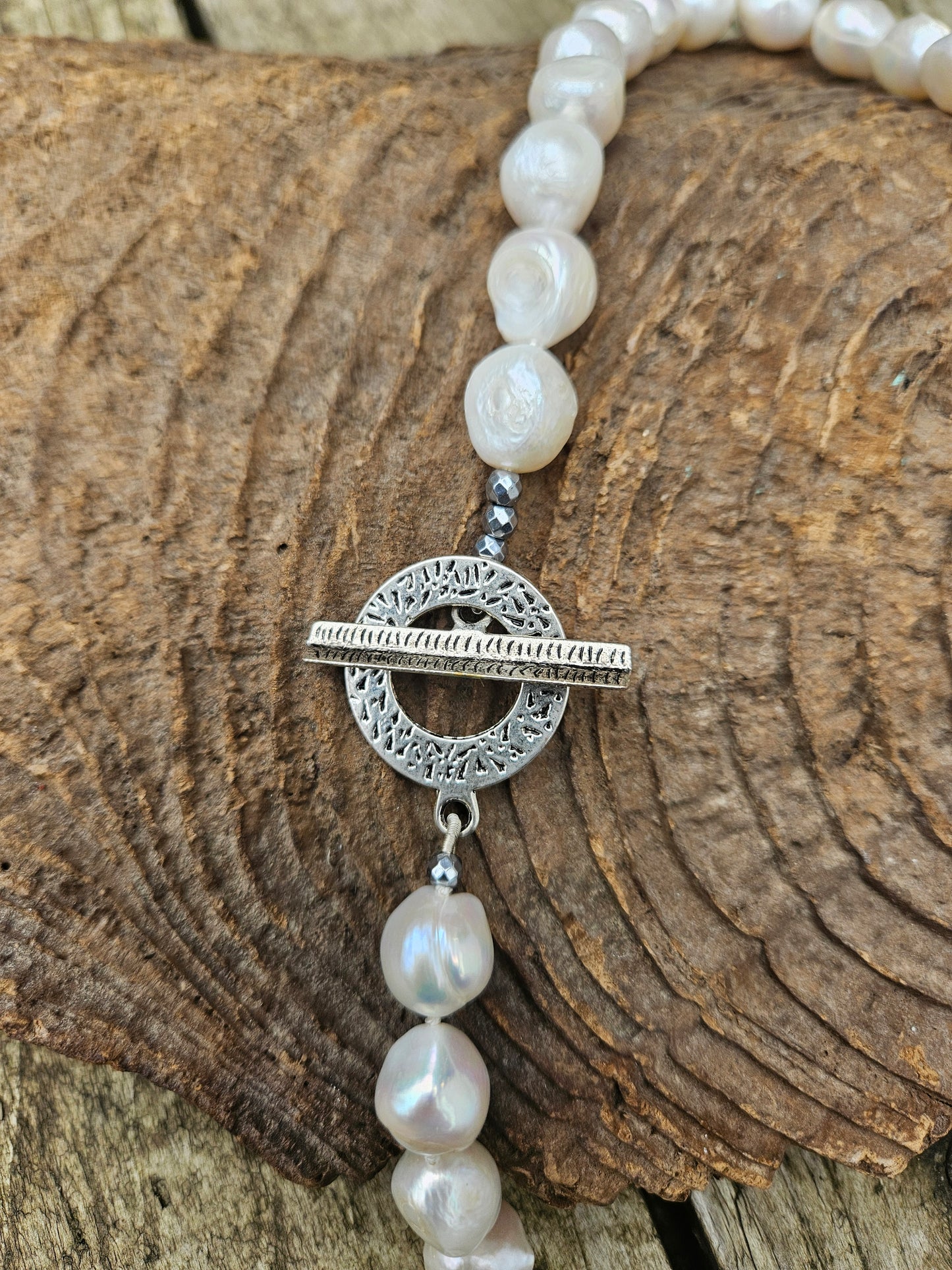 White freshwater pearls knotted on silk and finished on an embellished silver tone toggle clasp. Measuring 63cms in length.